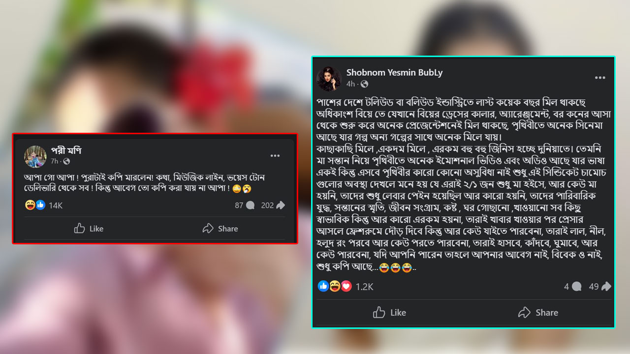 নিজের স্ট্যাটাসে পরীমণি লিখেছেন, ‘আপা গো আপা! পুরাটাই কপি মারলেন! কথা, মিউজিক লাইন, ভয়েস টোন ডেলিভারি থেকে সব! কিন্তু আবেগ তো কপি করা যায় না আপা!’
